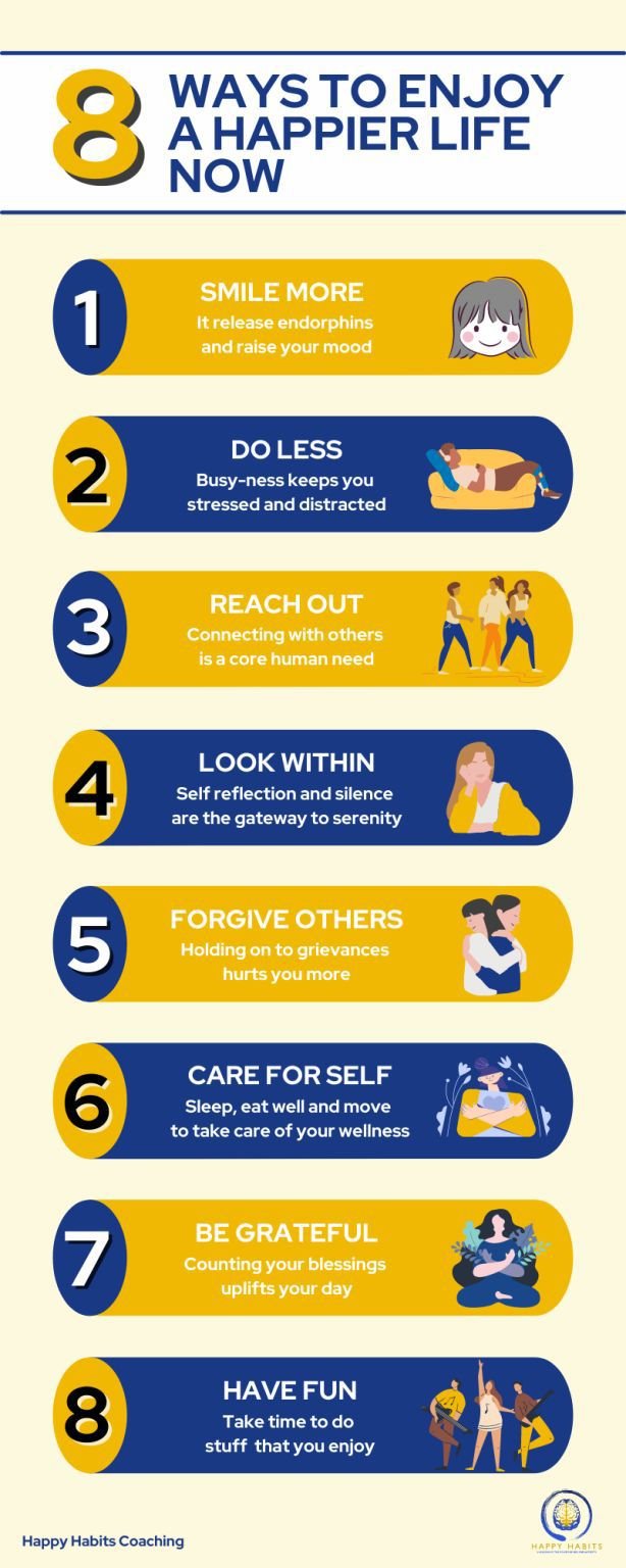 8 Ways To Enjoy A Happier Life: Smile more, Do less, Reach out, Look within, Forgive others, Care for self, Be grateful, Have fun.