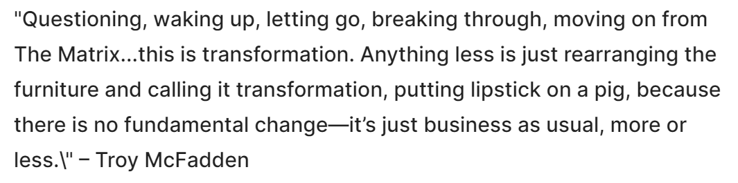 Questioning, waking up, letting go, breaking through, moving on from The Matrix…this is transformation. Anything less is just rearranging the furniture and calling it transformation, putting lipstick on a pig, because there is no fundamental change—it’s just business as usual, more or less. – Troy McFadden